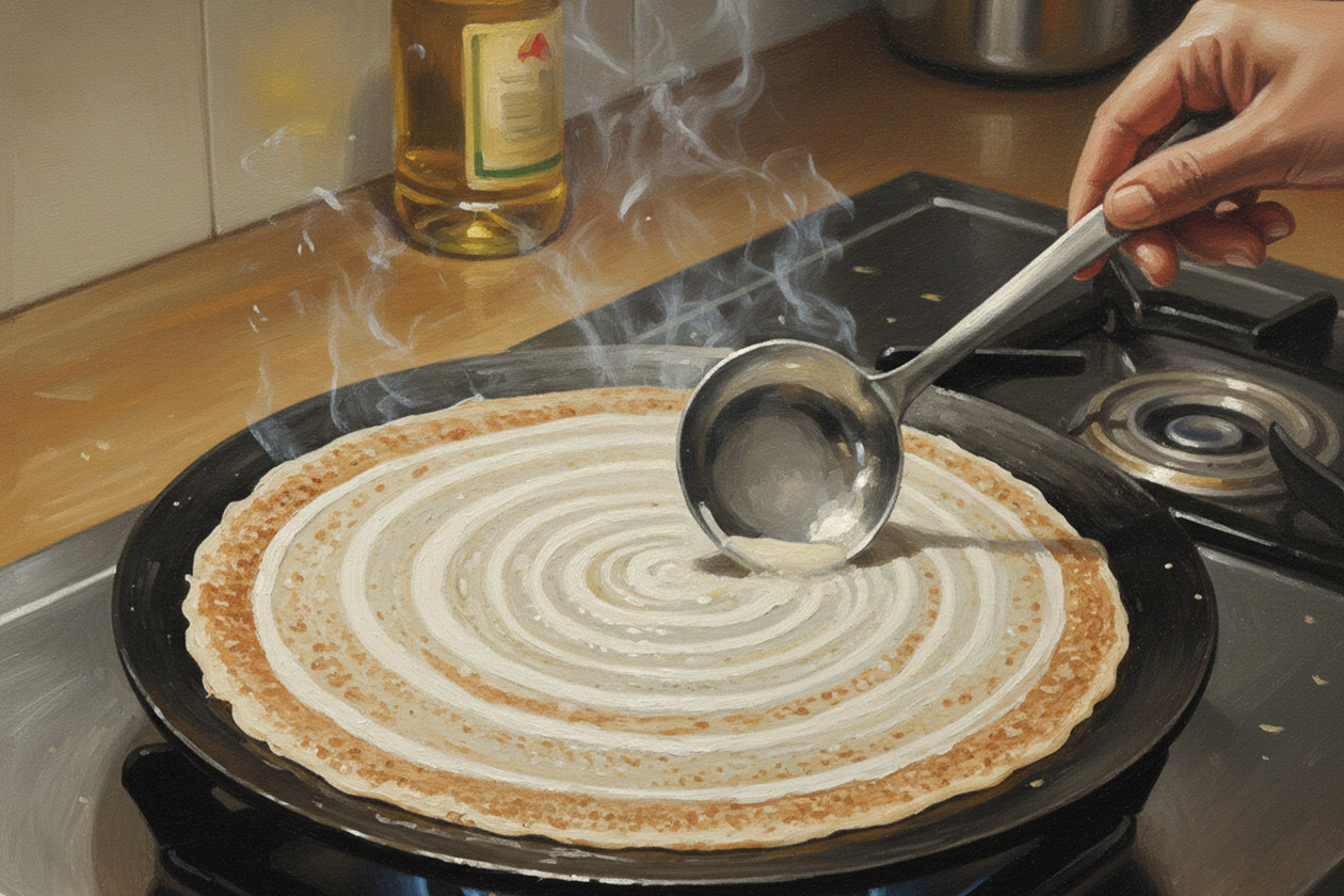 To make the perfect dosa, stir the batter before pouring it out on the pan.